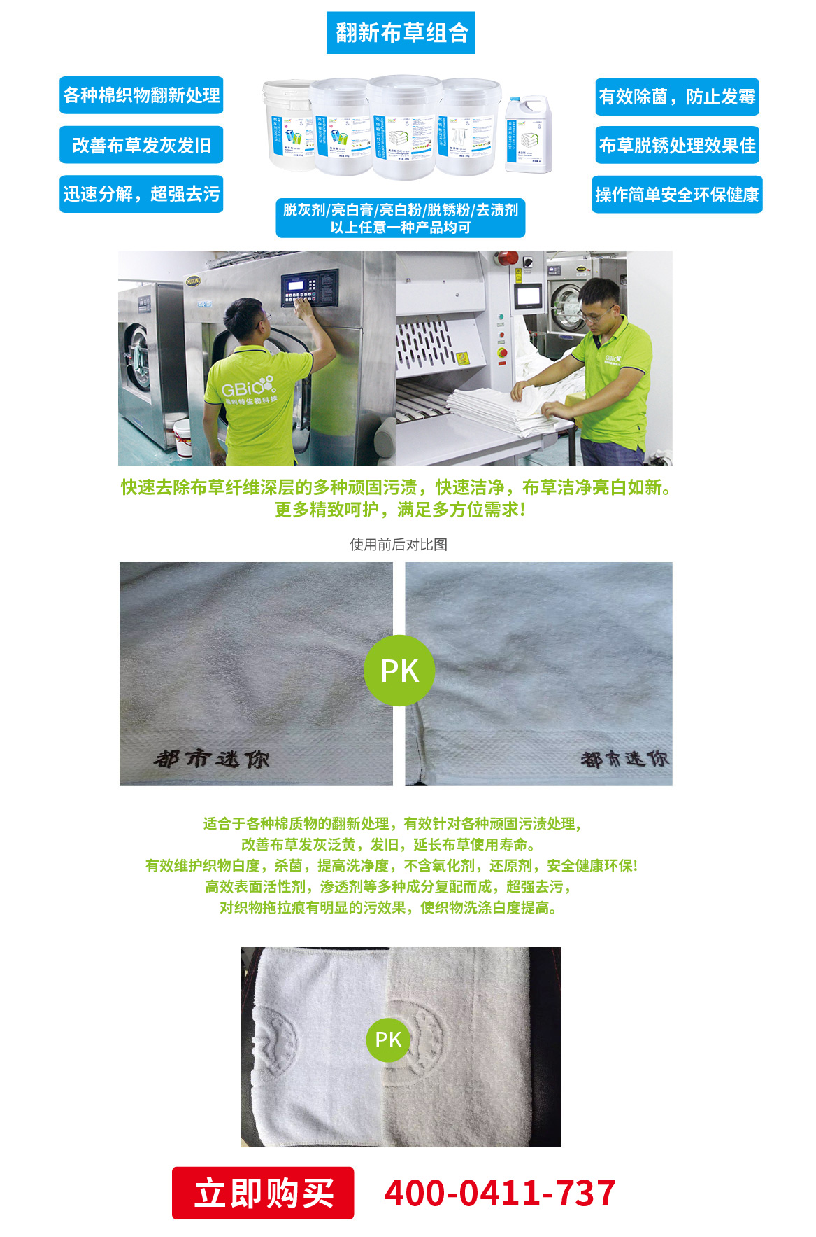 適合于各種棉質物的翻新處理,快速去除布草纖維深層的多種頑固污漬,快速潔凈,布草潔凈亮白如新。 更多精致呵護,滿足多方位需求!