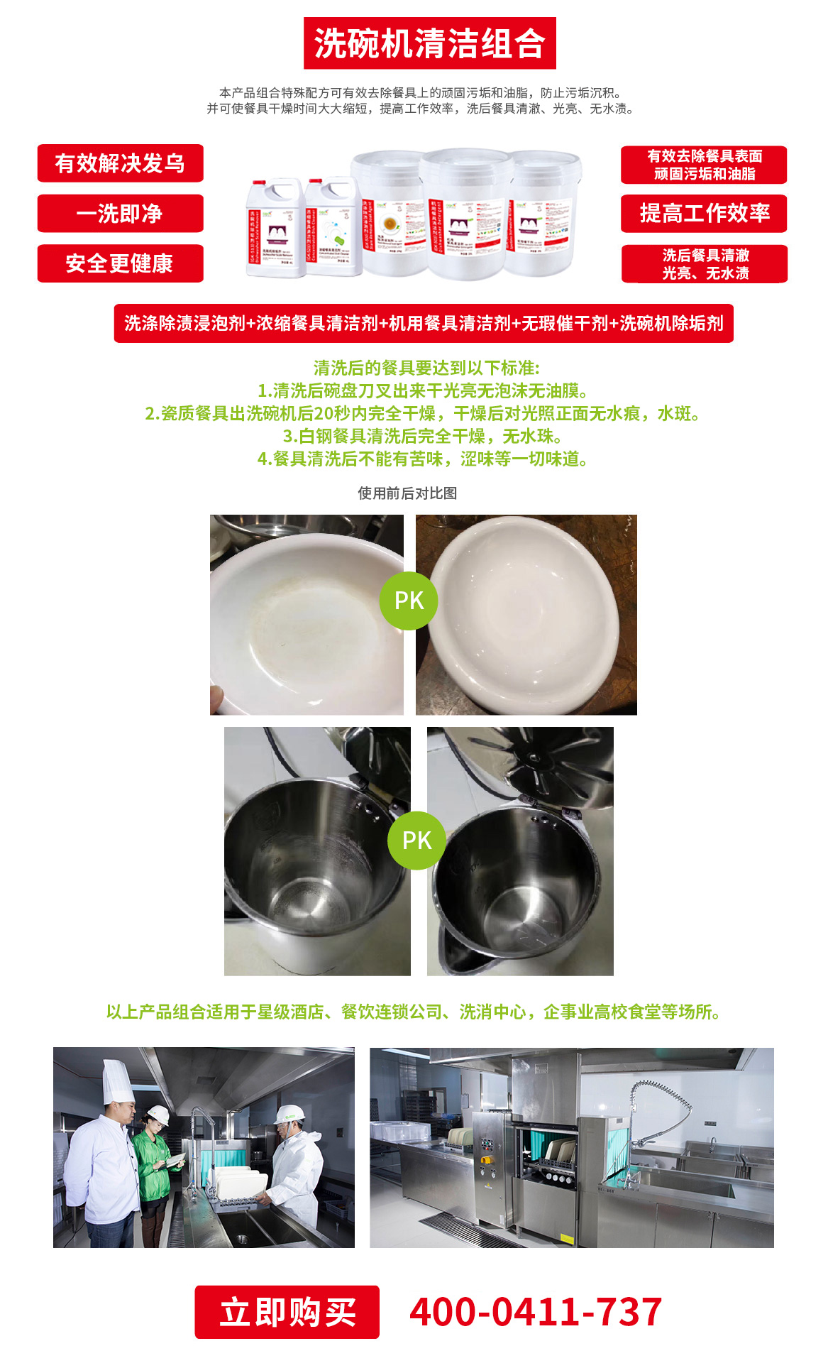 本產(chǎn)品組合特殊配方可有效去除餐具上的頑固污垢和油脂,防止污垢沉積。 并可使餐具干燥時(shí)間大大縮短,提高工作效率,洗后餐具清澈、光亮、無水漬。